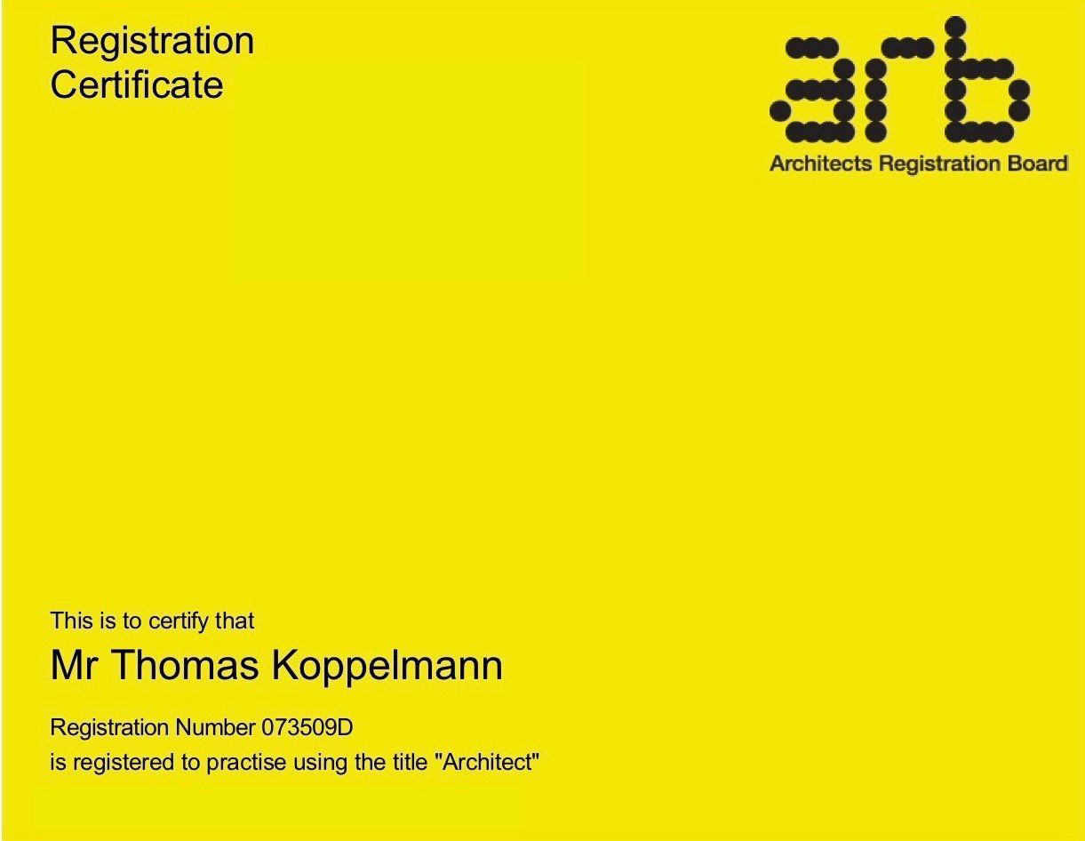 Nach erfolgreichem Abschluß des Part III Studiums an der Bartelett School of Architecture an der University of Central London (UCL), erfolgt die Aufnahme in das britische Architekten Register "Architects Registration Board" (ARB), London als eingetragener Architekt.