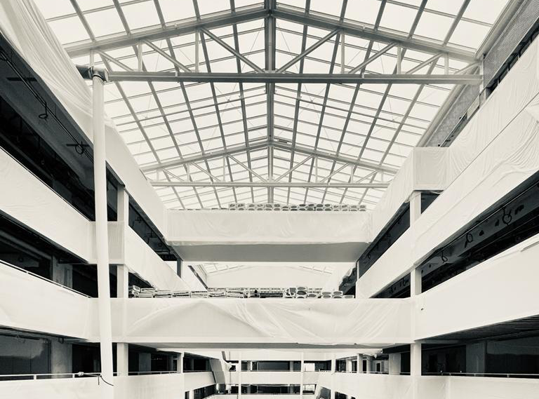 Foto vom Baufortschritt der neuen Hauptverwaltung der Otto Group in Hamburg-Bramfeld mit Blick in das Atrium, welches in die Stahlbetondecken des ehemeligen Lagergebäudes geschnitten wurde. Fertiggestellt ist das neue Glasdach darüber und weit fortgeschritten sind die umlaufenden Brüstungsverkleidungen.