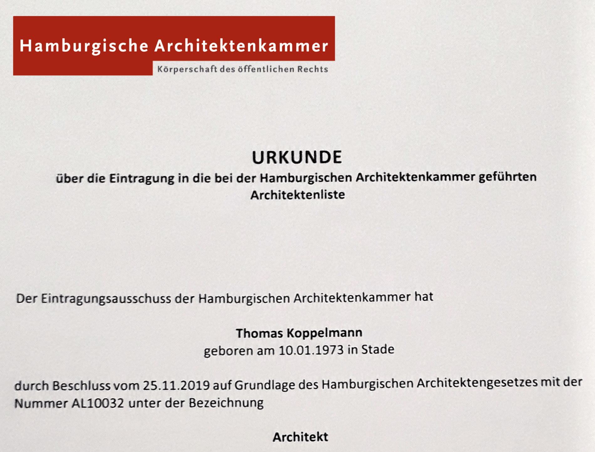 Eintragung in die Architektenliste der Hamburgischen Architektenkammer mit