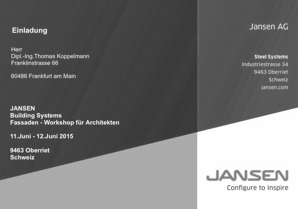 Teilnahme am zweitägigen Seminar & Workshop "Schüco-Jansen Fassaden" bei der Jansen AG in Oberriet, Schweiz. Neben Vorträgen von externen Referenten stehen auch eine Werksbesichtigung und Exkursionen zum "Würth Haus" in Rorschach sowie zum Hotel Congress Spa "Einstein" in St.Gallen auf dem Programm.